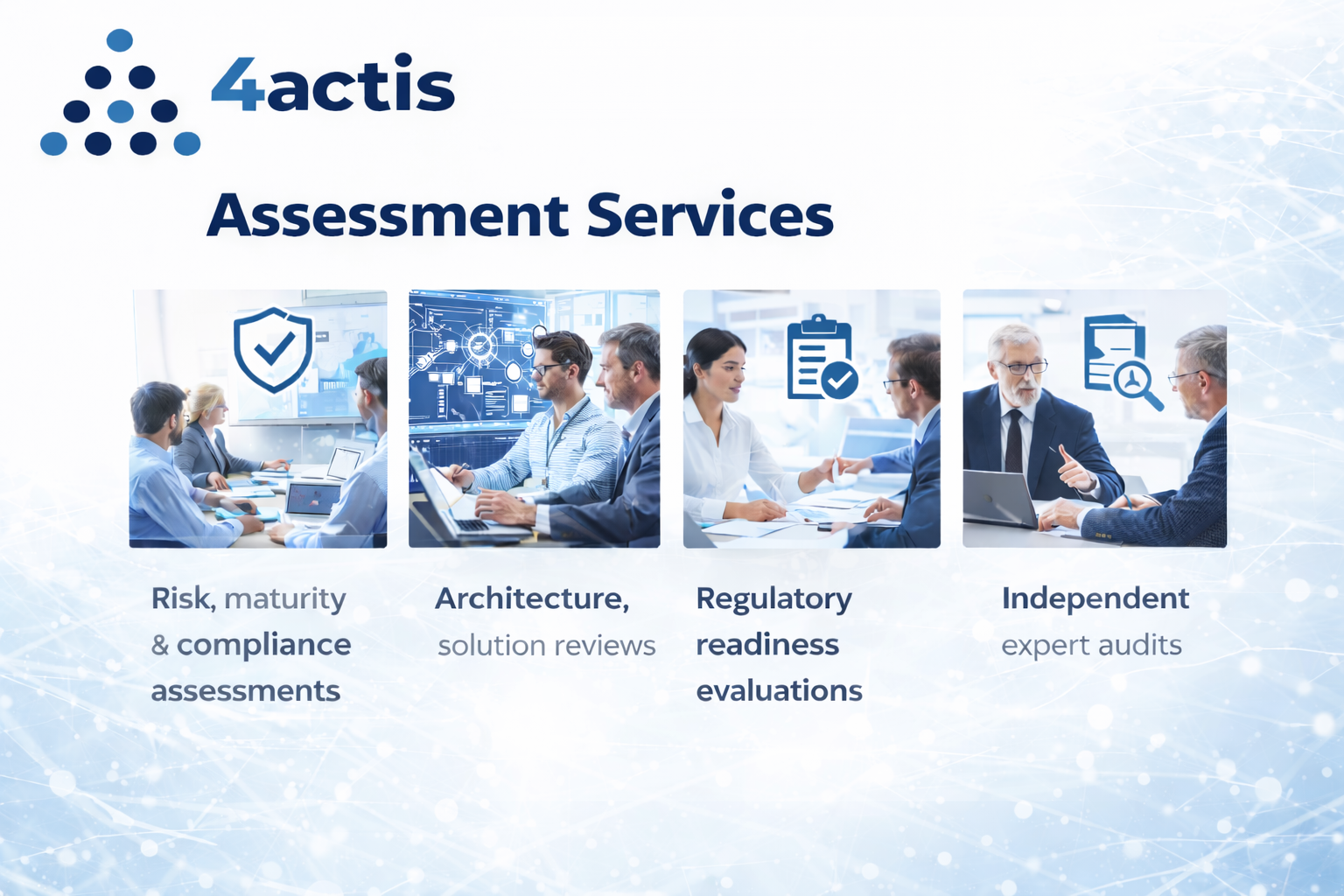 Our assessment stream provides independent, evidence-led insight into risk, maturity, and compliance. We conduct architecture, product, and solution reviews, evaluate regulatory readiness, and perform expert audits. The outcome is a clear, defensible understanding of current state, gaps, and priority improvement actions.