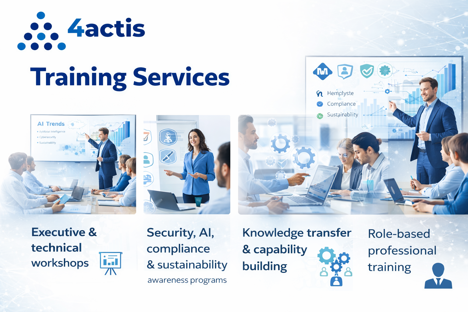Our training stream builds practical capability through role-based programs, executive briefings, and hands-on technical workshops. We deliver targeted awareness initiatives across security, AI, compliance, and sustainability, combined with structured knowledge transfer to strengthen organizational confidence, skills, and long-term internal capability.